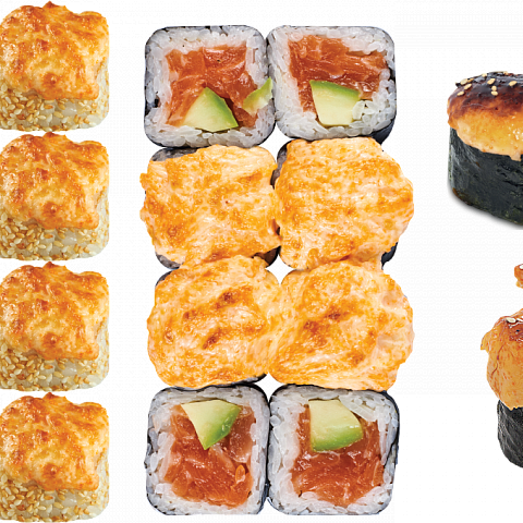 ролл Феникс - 8 шт., ролл Сяке - 8 шт., запеченный Гункан Креветка - 1 шт., запеченный Гункан Угорь - 1 шт., запеченный Гункан Мидия - 1 шт. (19 шт.)