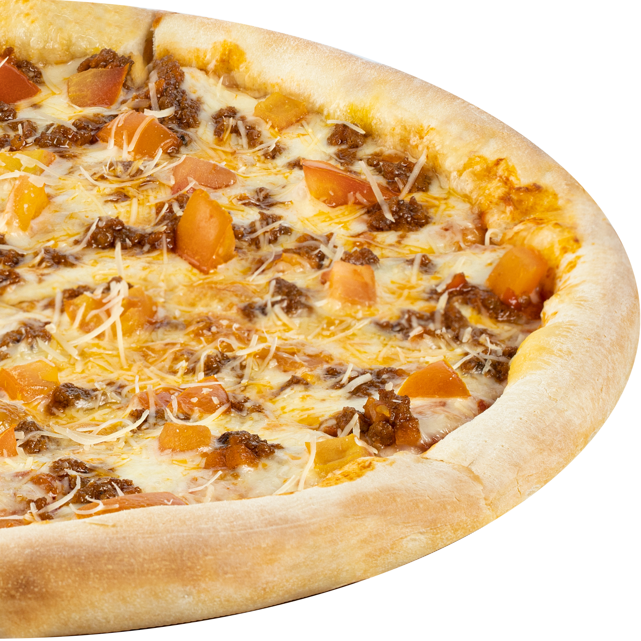 Состав: соус фирменный, фарш, сыр моцарелла, сыр пармезан, помидор