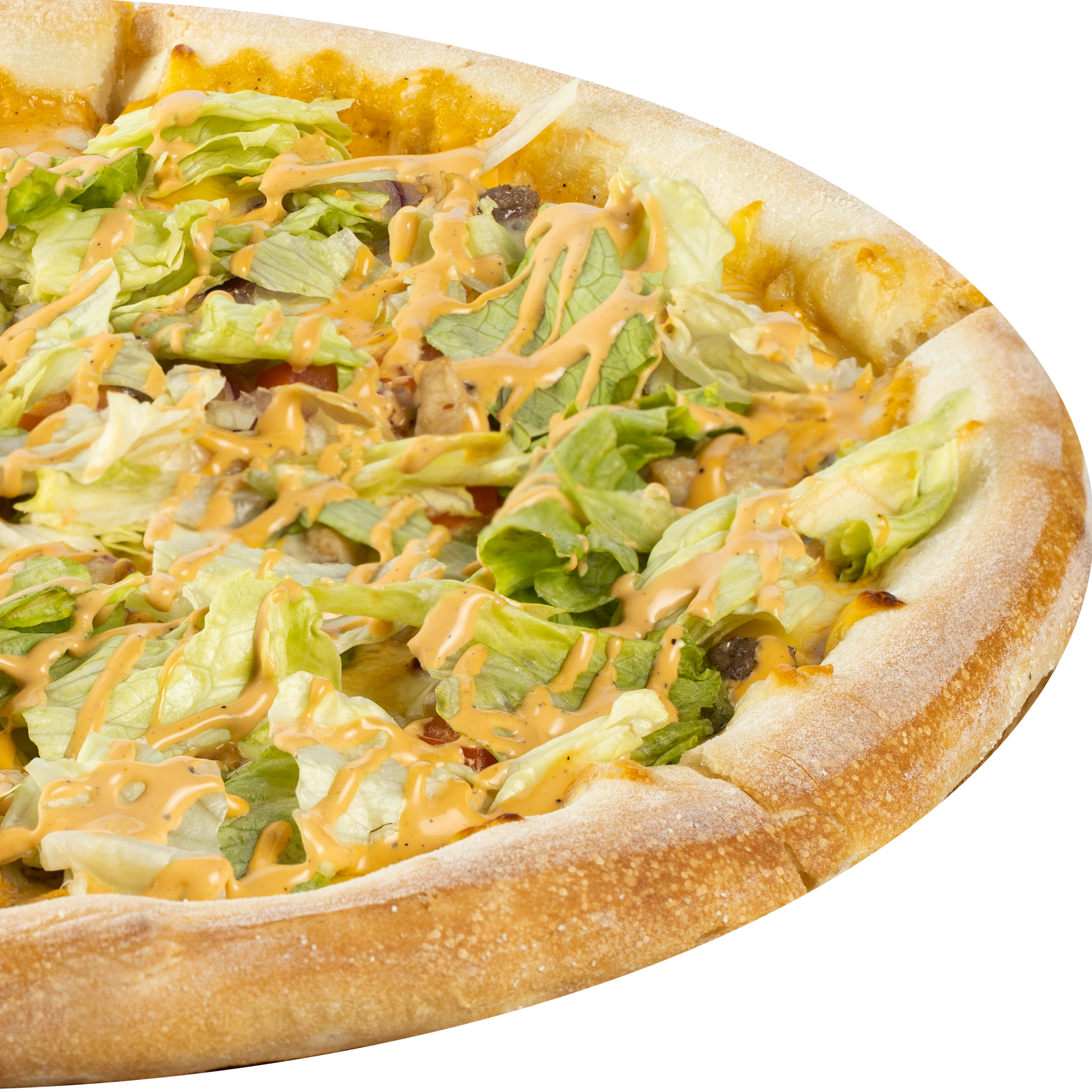 Состав: соус гриль, сыр моцарелла, сыр чеддер, фарш говяжий, помидор, лук красный, салат айсберг