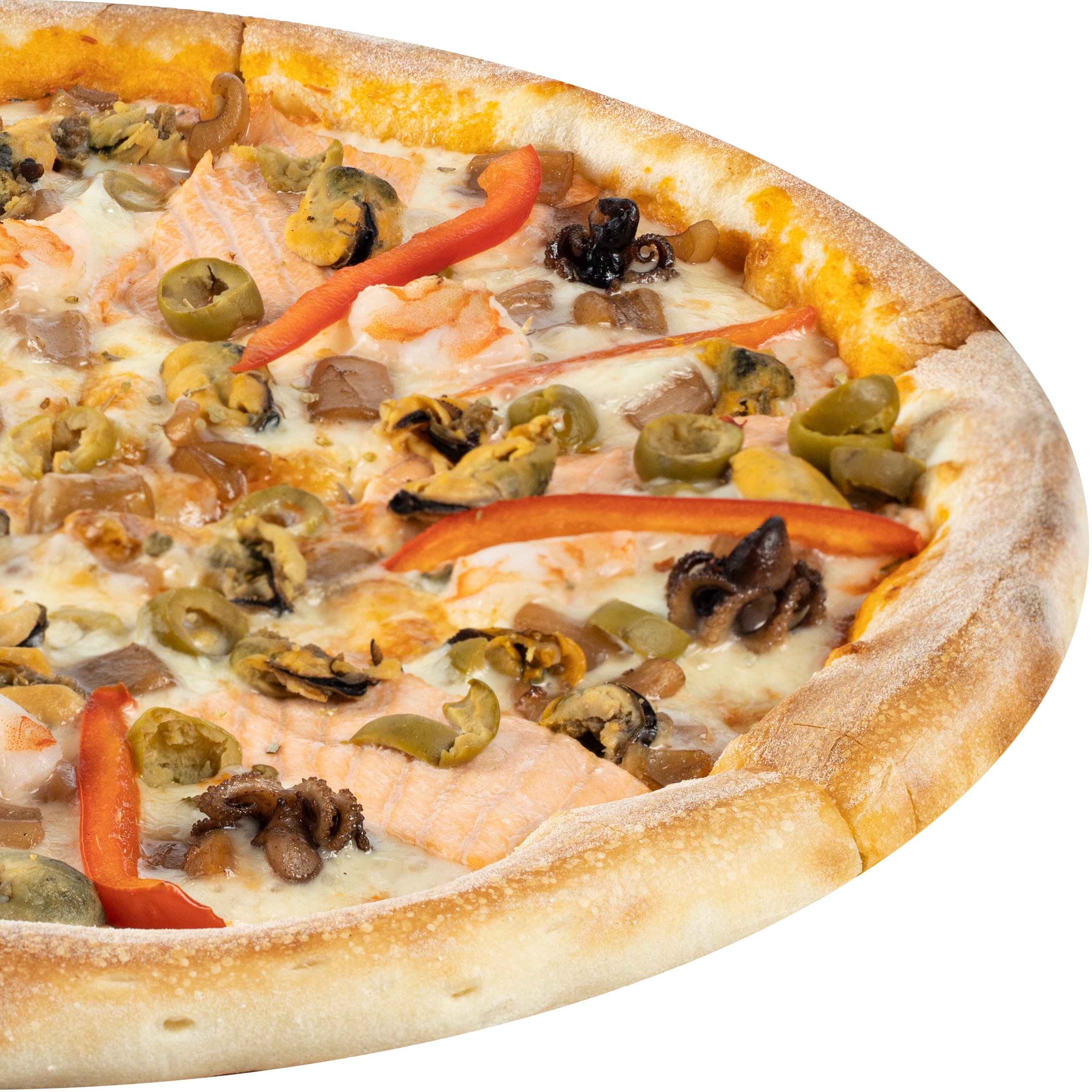 Состав: соус тар-тар, соус фирменный, перец болгарский, сыр моцарелла, оливки, креветки тигровые, кальмар, осьминог, лосось, мидии