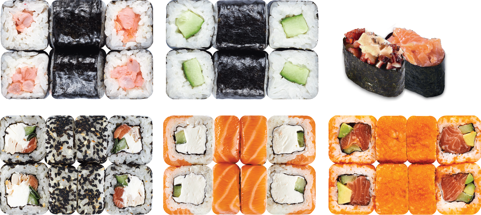 Состав: ролл Филадельфия Классик - 8 шт., ролл Калифорния Лосось - 8 шт., Мини ролл Огурец - 6 шт., Мини ролл Креветка - 6 шт., Спайси суши Тунец - 1 шт., ролл Родос - 8 шт., Гункан маки Осьминог - 1 шт., Гункан маки Лосось - 1 шт. (39 шт.)